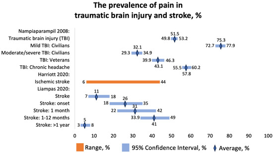 The prevalence of pain in traumatic brain injury and stroke, %. Nampiaparampil 2008 [37], Harriott 2020 [38], Liampas 2020 [39].