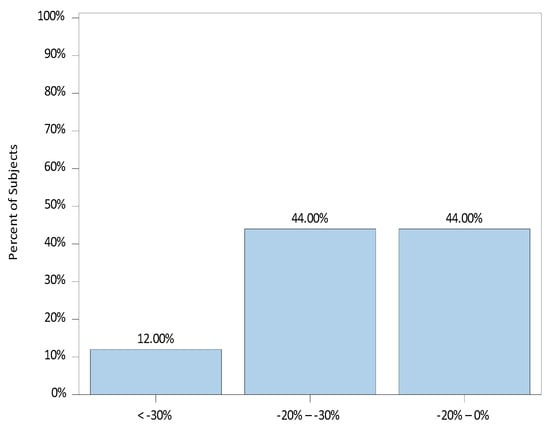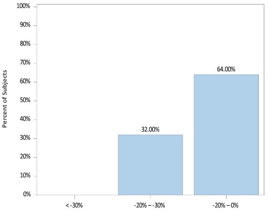 The median (range) percent change from baseline to the lowest MAP was −23.3 (−36.9, 0). There were 23 patients (92.0%) with a drop in MAP below their baseline, and 2 (8.0%) showed no drop. The distribution of percent changes from baseline to the lowest MAP is illustrated in Figure 1.