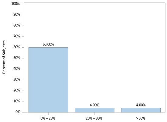 The median (range) percentage difference from the baseline to the highest HR was recorded as 9.2 (−3.3, 34.2). Of the 25 patients, 17 (68.0%) experienced an increase in HR above their baseline, whereas 8 (32.0%) showed no increase. The distribution of percent changes from baseline to the highest HR is illustrated in Figure 4.