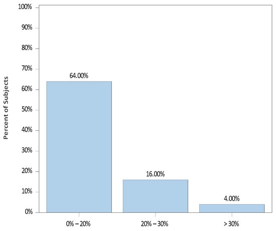 The median (range) percent change from baseline to the highest MAP was 0.0 (−11.1, 36.5). There were 9 (36.0%) patients with an increase in the highest MAP and 16 (64.0%) without an increase. The distribution of percent changes from baseline to the highest MAP is illustrated in Figure 2.