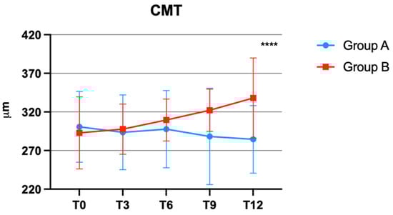 Central macular thickness (CMT) changes over time in groups A and B. **** p < 0.0001.