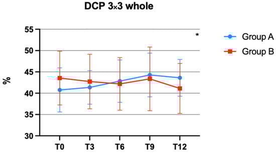 Deep capillary plexus (DCP) vascular perfusion (VP) changes over time in group A and B. * p < 0.05.
