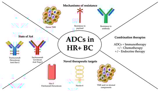 As a combination treatment, fulvestrant plus CDK4/6 inhibitors have been approved as first- or second-line therapy. Fulvestrant has been also approved in combination with the PI3K inhibitor alpelisib for PIK3CA-mutant HR+, HER2− locally advanced or metastatic BC after progression from first-line treatment with a single agent hormonal therapy [14,15]. More recently, the treatment paradigm for this subgroup has further evolved with the advent of ADCs, which have been shown, due to their mechanism of action, to be capable of providing tumor responses independently of the reference biomarkers detected. Therefore, this review aims to highlight the state of the art in the use of ADCs in HR + BC, focusing on their mechanism of action and resistance mechanisms, and to explain their future potential (Figure 1).