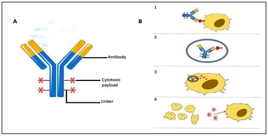 (A). Structure of ADCs. (B). Mechanisms of action of ADCs: (1) Identification of target and creation of ADC/antigen complex. (2) Intracellular internalization of ADC/antigen complex. (3) Release of cytotoxic payload. (4) Cell death and involvement of other tumor cells thanks to bystander effect.