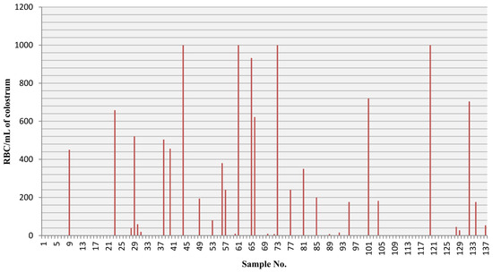 The distribution of RBCs (erythrocytes) per mL in the colostrum samples is presented in Figure 1.