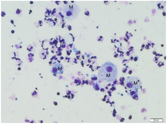 Human colostrum, magnification 400×. Macrophages (M) in the surroundings of other nucleated cells, mostly neutrophils. The figure represents the most common microscope image of colostrum samples of those we analyzed.