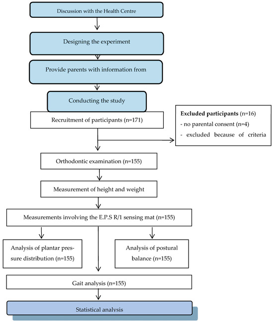 Our research team conducted the first stage of an investigation regarding correspondence between the podal system, gait parameters, and malocclusion. In the examination, gait, the distribution of foot pressure on the ground, and body balance were examined. The study group consisted of 76 patients aged 12–16 years and was divided into two categories—without malocclusion and with malocclusion. Angle’s classification was used, which enabled the determination of the anteroposterior relationship of the first molars. A pedobarographic mat was used to analyze the distribution of foot forces on the ground. The Wiva® Science diagnostic system was used for gait analysis and Kineod 3D was implemented for posture analysis. The performed research allowed us to prove that there is a relevant connection between the presence of stomatognathic disorders and walking rhythm, gait cycle duration, and right step duration time. Patients with malocclusion showed a high-speed walking rhythm and a decreased duration of the gait cycle, as well as of the right step. Furthermore, students with a proper relation between the jaws (Angle’s class I) presented a low-speed rhythm and an increased duration of the gait cycle and of the right step [10]. Analysis of the obtained results and the conclusions that we came to led us to investigate the issue once again, taking different types of anteroposterior malocclusion into consideration using Angle’s classes I, II, and III; Canine classes I, II, and III; and also vertical plane disorders including deep and open bites. Moreover, we decided to examine a larger population of children in order to make the results potentially more relevant. The field of interest in the research can provide important indications that will allow orthodontic practitioners to modify and improve existing algorithms for the treatment of malocclusions, e.g., enriching them with physiotherapy or specially selected physical exercises. The aim of the study was to analyze the relationship between various types of malocclusion and gait parameters, the distribution of foot pressure on the ground, and body balance. The hypothesis statement assumes that there is a relationship between dental abnormalities in malocclusion and some gait parameters, foot pressure on the ground and body balance, especially in the dominant part of the body (right foot).