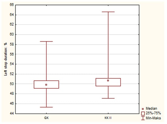Box mustache chart comparing the left step duration in the Canine class II group with the control. GK—Control group, KKII—Canine class II.
