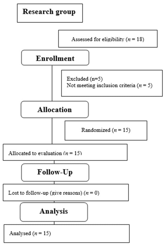 Initially, 18 patients aged 60–70 were enrolled in the study. After meeting the inclusion criteria, 15 patients (13 women and 2 men) participated in the study, with a mean age of 66.37 ± 2.97. In all patients, the right limb was the dominant limb. The right shoulder joint was operated on in 13 patients, and the left shoulder joint was operated on in 2 patients. The comparison group consisted of 15 healthy subjects (12 women and 3 men) aged 60–69 years (64.45 ± 3.12). Patients agreed to participate in the study.