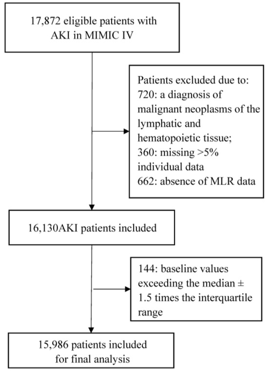 Given this evidence, it is plausible to speculate that MLR might impact the prognosis of AKI. However, there have been no epidemiological studies exploring the prognostic significance of MLR in critically ill patients with AKI. Therefore, aiming to capture the overall dynamics of the disease condition, we investigated the association between baseline and the early change within the first 15 days after ICU admission in MLR and all-cause mortality in these patients.