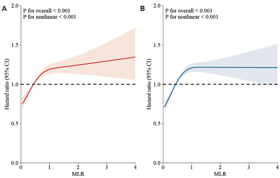 Potential nonlinearity for the levels of MLR with 30-day and 90-day mortality was measured by restricted cubic spline regression. The red and blue lines represented the estimated HR. The light red and blue areas represented the 95% CI. The MLR value of 4.8 was selected as the reference level. (A): MLR and 30-day mortality after adjusting the below confounders; (B): MLR and 90-day mortality after adjusting the below confounders. Adjusted confounders: age, ethnicity, vasoactive use, renal replacement therapy, Glasgow Coma Scale score, Sequential Organ Failure Assessment score, red cell distribution width, potassium, chloride, anion gap, mean corpuscular volume, blood urea nitrogen, serum creatinine, urine output, international normalized ratio, white blood cell, heart rate, temperature, percutaneous oxygen saturation, malignancy, shock, deficiency anemias, sepsis, coronary artery disease, liver disease, atrial fibrillation, and chronic obstructive pulmonary disease.