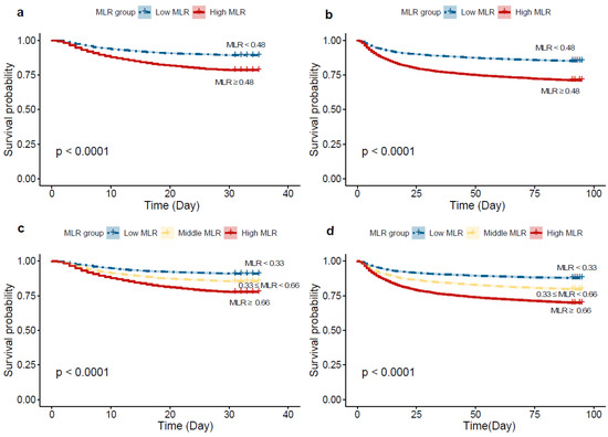 Kaplan–Meier curves of ICU 30-day and 90-day all-cause mortality for the low and high MLR groups. (a) grouping according to maximally selected rank statistics for 30-day mortality; (b) grouping according to maximally selected rank statistics for 90-day mortality; (c) grouping according to tertiles for 30-day mortality. (d). grouping according to tertiles for 90-day mortality.