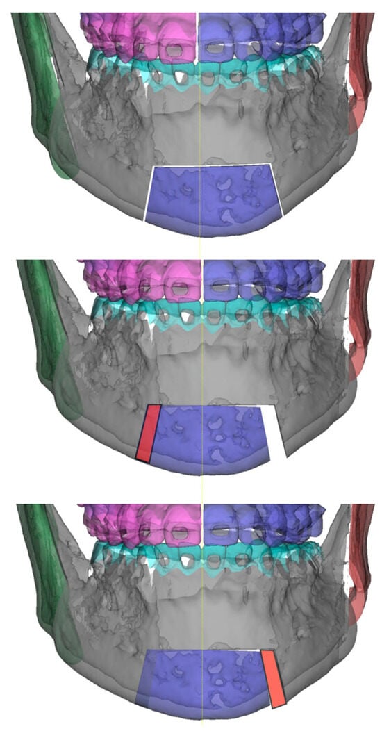 In telescopic genioplasty, a single rectangular block is cut and mobilized, while in Tetris genioplasty, the osteotomy design includes an additional vertical osteotomy. The width of this segment must be digitally assessed to match the skeletal midline with the dental midline (Figure 1).