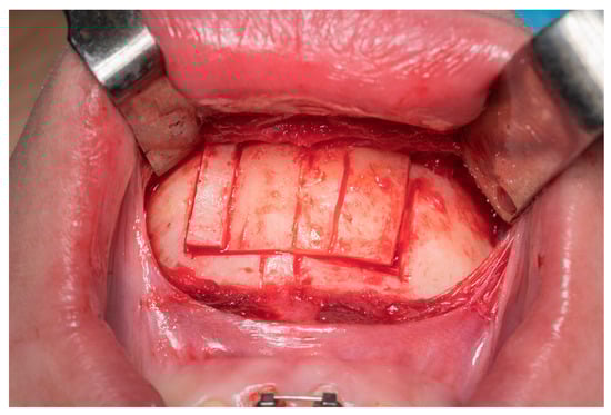 The entire procedure was performed under general anesthesia with nasotracheal intubation; about 10 min before the incision, plexiform anesthesia was performed to achieve hemostasis. The incision was made with an electric scalpel approximately 15 mm from the mucogingival line. The mental muscle was dissected subperiosteally, so exposure of the mental nerves and excessive dissection of the area are unnecessary. According to the telescopic genioplasty [], the osteotomy has a rectangular shape, the transverse limit is determined by the intercanthal distance, and the height should be between 15 and 20 mm from the mandibular border, considering the roots of the lower incisors.