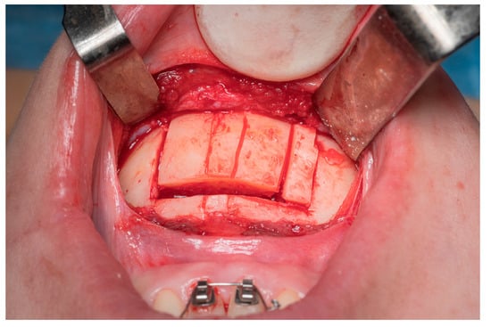 - Maglitto, F.; Sani, L.; Piloni, S.; Del Prete, G.D.; Arena, A.; Committeri, U.; Salzano, G.; Califano, L.; Friscia, M. Step-technique genioplasty: A case report. Int. J. Surg. Case Rep. 2022, 95, 107232. [Google Scholar] [CrossRef]