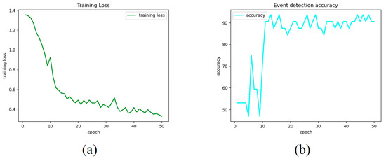 Both images and videos were used to evaluate the multi-task CNN. Figure 3a,b demonstrates the trend of the training loss and event detection accuracy for each epoch. The final model was then chosen for epoch 30, which was determined by experimental tests on images and videos to be the best tradeoff between the two branches of the network.