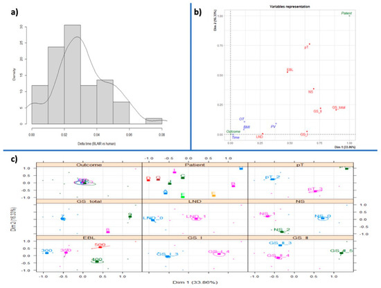 A similar result can be observed in the plot of the individuals provided by the MCA model (Figure 5c). This plot shows that each individual provides its own behavior and that the different patients can be clustered into different groups according to the values of all the categorical features, with the exception of the “outcome” variable. This result might suggest, once again, that no evidence is observed in differentiating the performance of BLAIR and clinical (human) in identifying bleeding conditions.