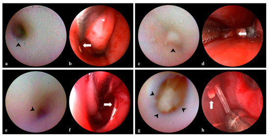 Dacryoendoscopy revealed all simple Hasner membrane blockages (defined above) (Figure 1a). During nasal endoscopy, the membrane was readily perforated without resistance or bleeding (Figure 1b). In terms of complicated blockages (defined above), a sickle knife was used during endoscopy to remove thick, dense fibrotic membranes (Figure 1c,d). When stenosis was present, the inferior meatus was narrower than the dacryoendoscope (Figure 1e). However, when the scope was moved, the Hasner valve was perforated as easily as the thin membrane of the simple type (Figure 1f). Sometimes, dacryoendoscopy revealed dacryoliths in the lacrimal sac (Figure 1g); these were fragmented under dacryoendoscopic guidance, the fragments were flushed out with saline, and success was confirmed by nasal endoscopy (Figure 1h).