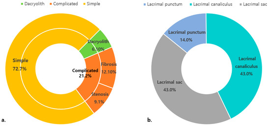 The LDS obstructions were classified by the dacryoendoscopic findings. All LDS patterns were associated with either simple or complicated Hasner’s valve obstructions. Sixteen eyes (48.5%) with stenosis exhibited simple obstructions. Among eleven eyes (33.3%) with mucus, eight and three had simple and complicated Hasner’s valve features, respectively. Four eyes (12.1%) with membranes and two (6.1%) with dacryoliths exhibited complicated Hasner’s valve features (Figure 3a). The LDS obstructive levels were as follows: canaliculus, 42.4%; sac, 39.4%; and nasolacrimal duct, 21.2%. The LDS obstructions were structural (n = 18) or secretory (n = 15) (Figure 3b).