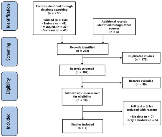 Of the 282 identified studies, 6 were eligible for the analysis, excluding 175 duplicated studies, 89 studies fitting the exclusion criteria, 7 studies without relevant data, and 5 gray literature studies (Figure 1). There were seven papers without appropriate data. Two papers were excluded because the comparison and control groups were not established, and two papers included children and adolescents in the target population. Three papers did not present appropriate OR or RR values that could be used in this study. There were also five gray literature studies, which included short progress reports presented at conferences, which had not been peer-reviewed. Egger’s regression test indicated no significant publication bias (p = 0.7218), as shown by the funnel plot (Figure S1 in the Supplementary Materials).