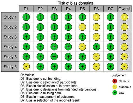 With respect to the risk of bias assessment for six studies in this meta-analysis, one study had a moderate risk of bias due to confounding, two studies had a moderate risk of bias due to missing data, and five studies had a moderate risk of bias in the selection of the participants and the reported results. Accordingly, no study was judged to have a ‘high risk of bias’ in the seven domains, and all studies were judged to have a moderate risk of bias. Thus, all studies were included in the analysis (Figure 2).