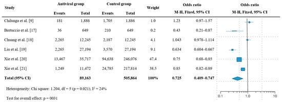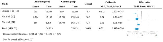The remaining three studies reported relevant results [,,]. Hospitalization and emergency room visits were reduced by 67.2% in the nirmatrelvir/ritonavir group (95% CI = 0.607–0.745, p < 0.005) []. Similarly, the absolute risk reduction at 180 days for hospitalization or death was 2.15 (95% CI = 1.85–2.46) and 2.00 (95% CI = 1.37–2.62) in the nirmatrelvir/ritonavir and molnupiravir groups, respectively [,]. The total prevalence of hospitalization or death in the antiviral treatment group was 27.9% lower than that in the nonantiviral treatment group (k = 3, OR = 0.721, 95% CI = 0.697–0.794, I2 = 39%, p = 0.027; Figure 4). Although a high level of heterogeneity was observed, it was not significant (Q = 0.672, df = 1, p = 0.287).