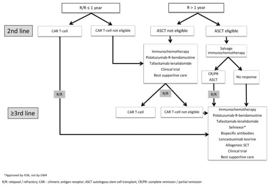The standard second-line therapy for relapsed or refractory (R/R) patients to first-line therapy is salvage high-dose chemotherapy, followed by an autologous stem-cell transplant (ASCT) [7] (Figure 1). However, only healthy patients without comorbidities benefit from this strategy [7]. Moreover, as shown in the SCHOLAR-1 study, patients with primary refractory disease or in relapse within 12 months after first-line therapy respond poorly, even with this intensive therapy, with an objective response rate (ORR) of 26%, a complete remission (CR) rate of 7%, and a median overall survival (OS) rate of 6.3 months [8].