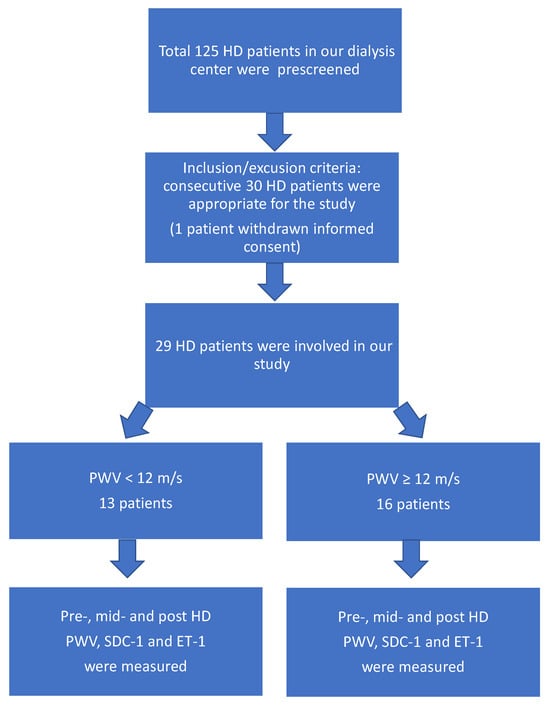 The patients were divided into two groups based on their pre-HD pulse wave velocity (PWV < 12 m/s vs. PWV ≥ 12 m/s), as a PWV < 12 m/s is considered normal by the ESC/ESH guidelines [23] (Figure 1).