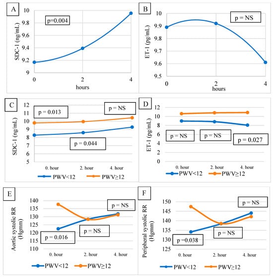 The pre-HD and mid-HD SDC-1 were higher in the PWV ≥ 12 m/s group (10.174 ± 2.568 vs. 7.928 ± 1.794 ng/mL, p = 0.013, and 10.319 ± 3.482 vs. 8.248 ± 1.793 ng/mL, p = 0.044, respectively). There was no difference in the post-HD SDC-1 levels between the groups (Table 2 and Figure 2C).
