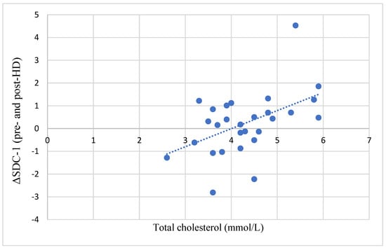 A significant positive correlation was found between the difference in the pre-HD and post-HD SDC-1 levels (ΔSDC-1) and the serum total cholesterol levels (Figure 3).