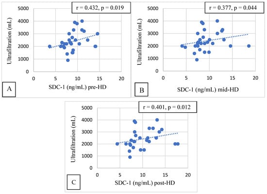 Pre-, mid-, and post-HD SDC-1 had a significant correlation with the ultrafiltration volume (p = 0.019, p = 0.044, and p = 0.012, respectively, Figure 4).