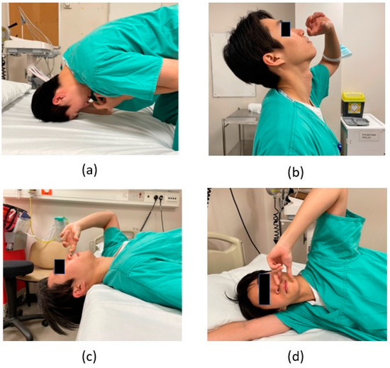 Various positions to apply medication into the nose. (a) Head down and forward position (HDF); (b) Head back position (HBP); (c) Lying head back (LHB); (d) Kateiki.