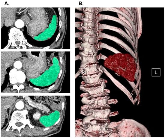 Measurement of splenic volume using abdominal computed tomography imaging. Spleen (green) in horizontal section was traced by the software in each slice (A). Three-dimensional image of spleen was displayed (B). SYNAPSE VINCENT software, version 2.0003, developed by Fujifilm in Tokyo, Japan, was used to measure splenic volume. Using the software’s preset algorithm for extracting elliptical tissue, the software automatically recognized the spleen when the long axis of the spleen was specified from a multi-slice computed tomography scan cross-sectional image (spleen was traced and colored in green in each slice). All the recognized splenic images were constructed in three dimensions and output as an image, and its splenic volume was automatically calculated. In cases where necessary, manual adjustments were made to the trace before arriving at the final measurements. For the independent variable, we indexed the value of splenic volume. R, right; L, left.