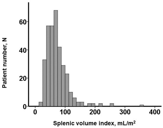 Distribution of splenic volume index obtained before transcatheter aortic valve replacement.