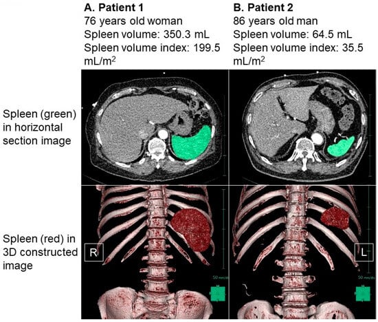 Representative cases of high splenic volume index (A) and low splenic volume index (B). Spleen was colored in green in horizontal section image and was colored in red in three-dimensional constructed image. (A) Patient 1 was 76-year-old woman. Body height was 160 cm and body weight was 72.3 kg. Her splenic volume index was calculated as 199.5 mL/m2. (B) Patient 2 was 86-year-old man. His body height was 161 cm and body weight was 76.8 kg. His splenic volume index was calculated as 35.5 mL/m2. Splenic volume was larger in patient 1 compared to patient 2 in both 2-dimensional and 3-dimenstional imaging. R, right; L, left.