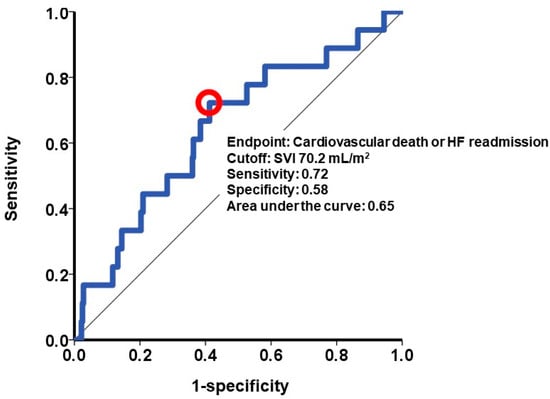 Cutoff of splenic volume index to estimate the primary outcome. The primary outcome was defined as 2-year cardiac death or heart failure readmission. A cutoff of splenic volume index was calculated at 70.2 mL/m2 by receiver operating characteristics analysis and shown as a red circle in this curve. SVI, splenic volume index; HF, heart failure.