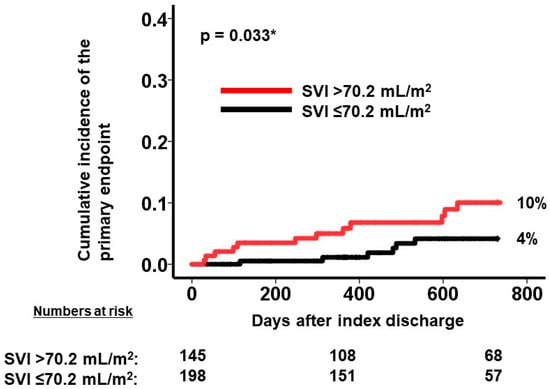 A calculated SVI cutoff of 70.2 mL/m2 (Figure 4) was identified as a predictor for the primary outcome. Out of the patient cohort, 145 individuals possessed SVI values exceeding 70.2 mL/m2. The patients with a higher SVI exhibited a significantly greater cumulative incidence of the primary outcome, with rates of 10% compared to 4% in those with a lower SVI (p = 0.033; Figure 5).