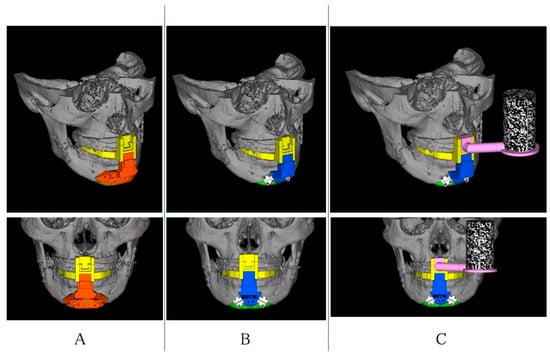 Computer-aided design of the three-dimensional devices: (A) splint (yellow) and osteotomy device (red); (B) repositioning device (blue); and (C) registration marker (pink and monochrome mosaic).