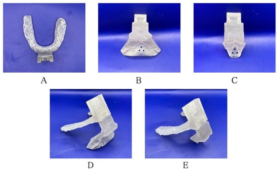 Three-dimensional devices made by a three-dimensional printer: (A) surgical splint; (B) osteotomy device; (C) repositioning device; (D) surgical splint connected to the osteotomy device; and (E) surgical splint connected to the repositioning device.