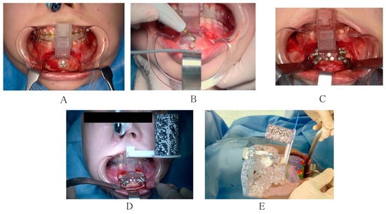 The osteotomy was performed using an ultrasonic cutting instrument along the slit of the osteotomy device (Figure 3A,B). The repositioning device was fixed instead of the osteotomy device using the previously drilled holes as the reference points. Following that, the bone segment was fixed to the repositioning device. The bone segments were guided to the planned position using the repositioning device (Figure 3C). After connecting the registration marker to the splint junction, the correct repositioning of the mandible was confirmed in 3D using HoloLens 2. Once it was confirmed to be in the position specified in the virtual surgery, the repositioning device was removed, and two resorbable four-hole plates were used to fix the chin segment to the main body of the mandible (Figure 3D,E).
