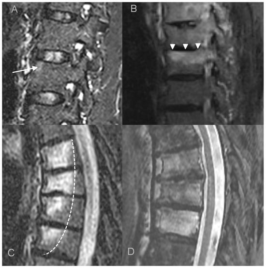 Figure 1. Bone marrow edema (BME) patterns appreciated on T2 FS/STIR MRI images. (A). corner inflammatory lesions (arrow); (B). propagating (arrowheads); (C). semicircular/curvilinear (dotted line); (D). diffuse—patchy (in the upper two vertebrae) and solid (in the lowest vertebra).- vertebral body corner inflammatory lesions (CIL)—active Romanus lesion defined as small foci of BME at the vertebral corners,