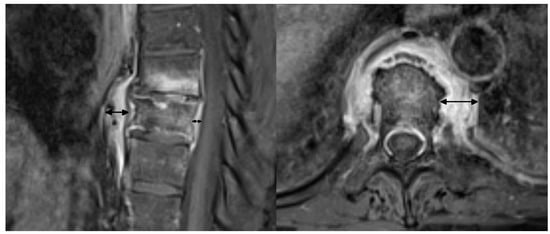 - the thickness of paravertebral soft tissue inflammation measured on both sagittal and axial T2 fat saturated or T1 fat saturated contrast enhanced images and the thickness of intracanal epidural inflammation measured on sagittal images (Figure 2),