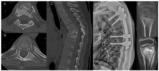 Imaging findings in a 10-year-old patient with CRMO (patient 16.). Axial CT scans show erosions in the facet (A) and costovertebral (B) joints. Sagittal CT reformat shows osteodestructive lesions with vertebra plana deformity (C) that led to progressive kyphosis with spinal stenosis requiring transpedicular stabilization (D). Another site of the disease was found in the tibia (E) with CT and MRI showing metaphyseal osteolysis with adjacent osteosclerosis, extensive bone marrow edema and solid periosteal reaction.