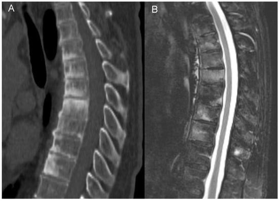 In adults, the main findings were BME, osteosclerosis, endplate irregularities, and a spectrum of ankylosing lesions. Similar to previous publications, the lesions were multilevel and contiguous [,,,]. Curvilinear/semicircular pattern of BME found in the majority of patients in the study by McGvuran and coworkers was less common in our material three patients); however, both BME and osteosclerosis overlapping BME on plain film/CT were definitely the most striking abnormalities (Figure 4) []. We also observed a long persistence of BME that was present through the whole length of follow up, even in patients followed for more than 10 years. On MRI, contrast enhancement was observed in the areas of BME, but also in the linear fashion along the endplates and frequently in the non-ankylosed costovertebral and facet joints. Paraspinal soft tissue involvement was observed in 10 out of 12 patients subjected to MRI (83%), more often than in previous publications [,]. In agreement with previous reports, most of the intervertebral discs showed decreased T2 signal corresponding to degeneration rather than the high signal seen in discitis []. Vertebral deformities were limited to anterior wedging, most pronounced at the apex of thoracic kyphosis. Ankylosing lesions were prevalent and, as previously reported, showed a progressive character on follow up [,]. Anterior bony bridging resembling this observed in diffuse idiopathic skeletal hyperostosis (DISH) was accompanied by intervertebral fusion and facet joint ankylosis. Contrary to previous reports, we have not observed the resolution of hyperostosis once ankylosis was complete [].