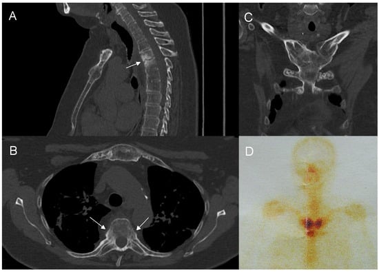 - Peffers, G.; James, S.L.J.; Stirling, A.; Jobanputra, P. Thoracic spine osteitis: A distinct clinical entity, a variant of SAPHO or late-onset non-bacterial osteitis? Rheumatology 2012, 51, 191–193. [Google Scholar] [CrossRef][Green Version]