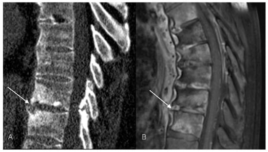 Unstable Anderson lesion in a 65-year-old patient with SAPHO syndrome. Sagittal CT reformat (A) and MRI (B) shows interruption of syndesmophytes and disc space widening (arrows).