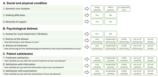 Retinal diseases and comorbidities have a profound impact on the quality of life (QoL) [13]. Since a significant portion of treated patients are elderly, this target group often suffers from other health problems and polypharmacy and experiences daily limitations even before regular treatment visits, and ocular discomfort introduces additional burdens for both patients and potential caregivers [14]. Questionnaires that focus solely on QoL dimensions do not adequately capture the personal situations and treatment commitments of patients. Therefore, we have developed an exploratory tool aimed at comprehensively elucidating patients’ social, physical, and psychological conditions. This tool should aid in understanding the utilization of care by patients and in potentially identifying internal or external barriers and limitations to therapy.