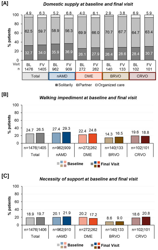 Domestic care situation (A), prevalence of walking difficulties (B), and need for an accompanying person (C) at the baseline and after twelve months of treatment. BL, baseline; and FV, final visit.