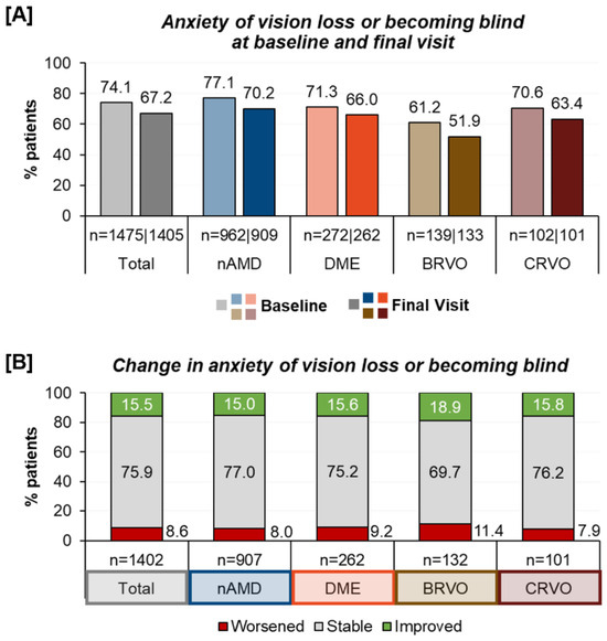 Anxiety of vision loss and blindness (A) and change in anxiety from the baseline to the final visit for all treatment indications (B).