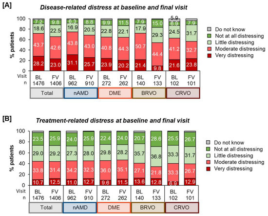 Improvements in distress estimation were correlated with changes in the best corrected visual acuity (BCVA), as shown in lower part of the Figure 5A,B. A heat map analyzing the correlation of patients’ disease and treatment distress perception showed no clear correlation of disease and treatment distress, highlighting the value of separately assessing both disease and treatment distress (Figure S2).